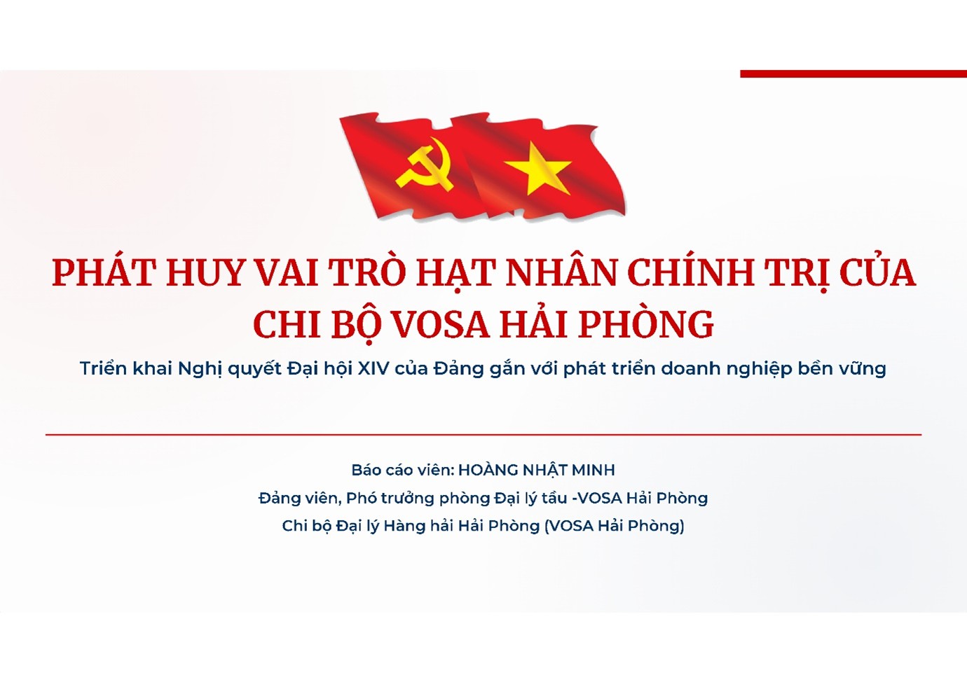 Chủ đề dự thi: "Phát huy vai trò hạt nhân chính trị của Chi bộ VOSA Hải Phòng trong triển khai Nghị quyết Đại hội XIV của Đảng gắn với phát triển doanh nghiệp bền vững".