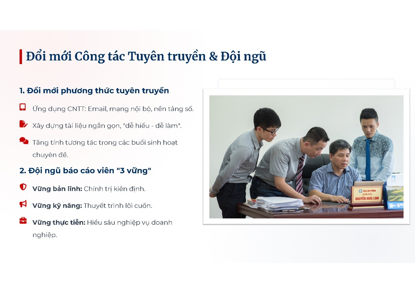 - Xây dựng nhân tố con người: Kiến tạo đội ngũ cán bộ, đảng viên đoàn kết, trách nhiệm và chuyên nghiệp.